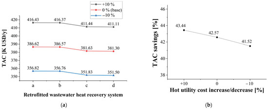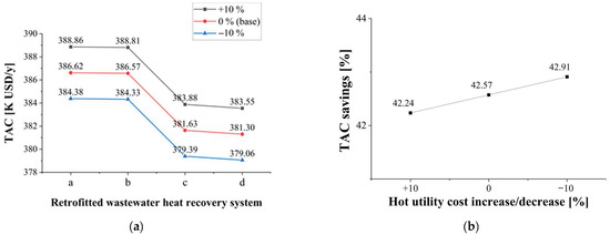 Second, sensitivity analysis of on TAC was conducted by increasing or decreasing by 10%, since can fluctuate according to the type of fuel used for making utilities, the efficiency of the boiler, etc. [24]. Figure 8a shows the TAC change of each retrofitted wastewater heat recovery system when increases or decreases by 10%. Figure 8b shows the maximum TAC savings according to the change in .