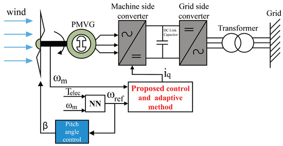 The maximum power point tracking (MPPT) controllers have been developed to increase the maximum power extraction (MPE) capability of the variable-speed WT generators under various wind conditions [11]. It can be divided into two methods: pitch angle regulation and rotor speed regulation-based MPPT control techniques. In this regard, the authors establish various MPPT methods for maximizing wind power, such as linear quadratic Gaussian (LQG) control [12], sliding mode control [13,14], fuzzy control [15] and optimal power curve estimation algorithm [16]. Even so, these techniques have significant disadvantages, including the lack of ability to follow references and reject system disturbance. Furthermore, the authors in [17] have introduced the polynomial disturbance observer-based MPPT control techniques for WECS, which can determine the aerodynamic torque, wind speed and electromagnetic torque without sensors. However, this approach has high computational complexity. Similarly, an adaptive hybrid intelligent MPPT control was investigated in [18] to approximate the effective wind speed and the optimal rotor speed of variable-speed wind turbines. The authors in [19] have proposed an adaptive perturbation and observation approach-based MPPT scheme for PMSG-based WECS, in which step size is proportional to the slope, and it enhances the tracking capability. However, constantly changing wind conditions can cause the step size to be larger, affecting the tracking performance. Unlike the previously described MPPT methods, the proposed method can significantly improve the dynamic performance of the PMVG-based WECS to achieve an MPE from the varying wind speed conditions.