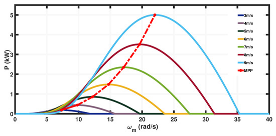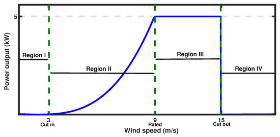 In general, there is an ideal TSR for each WT blade pitch angle ; it is indicated by . The maximum power coefficient = 0.441 is obtained from the ideal TSR-based MPPT, which typically captures maximum power of 5 kW at various wind speeds. As shown in Figure 2 the cut-in, rated, and cut-out speeds are 3 m/s, 9 m/s, and 15 m/s, respectively. In addition, Figure 3 shows the typical power curve used in this study, which was obtained from (1).
