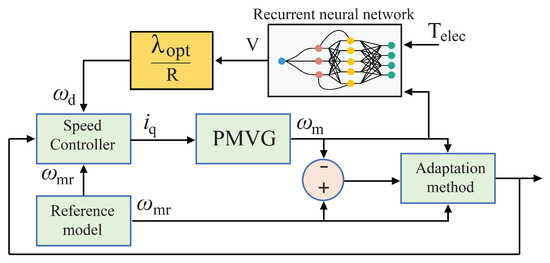 The conventional model reference adaptive control is presented in [28], and the reference model rotor speed is directly compared with the actual rotor speed . Likewise, in [29], the output of the reference model is compared to the electrical speed error, which is obtained from the real and desired rotor speeds. Based on the sampling period, the desired speed is changing. However, this study calculates the desired speed accurately from the RNN controller according to the obtained wind speed. Therefore, it gives a better dynamic performance, and the generator can extract the maximum power under wind speed variation. Figure 4 shows the block diagram of the proposed RMAC and RNN-based wind speed estimation controller. In (4), the rotor speed is in the form of a first-order derivative. Therefore, the reference model is also taken in the same way as follows [29]: