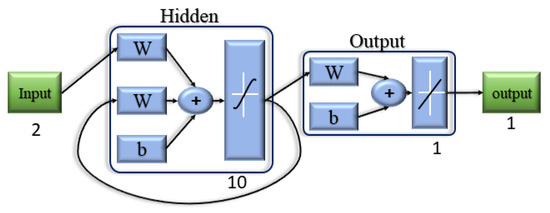 Based on [31], the wind speed is measured using wind speed sensors. However, in this study, the wind speed V is measured using the generator speed and the electromagnetic torque . Therefore, the RNN inputs are and and the output is V. In the input layer, the inputs are and and the following is output: