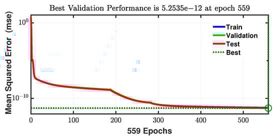 On the other hand, an RNN is trained using the numerical model of the PMVG-based WECS. In addition, the generator speed and torque are used as inputs, and the output is the wind speed. These are calculated within the range of 2–4 m/s and with the respective rotor speed and generator torque with an increment of 0.25 m/s. Moreover, the calculated numerical data are considered as training data. After training, validating, and testing, the mean square error is reached not more than 400 iterations, as shown in Figure 6. Therefore, the proposed NN can provide the estimated wind speed output with very minimum error value.