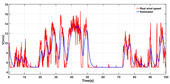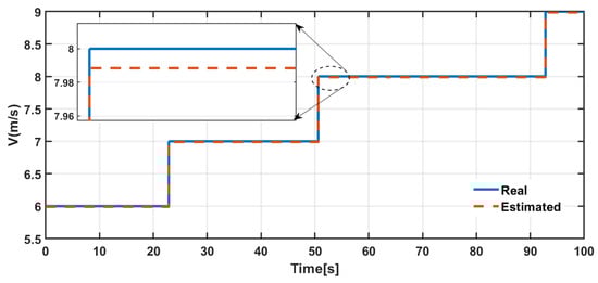 In this case, actual wind speed data for 10 min are gathered from the place of Gunsan in South Korea. It is measured by using an anemometer, which is called point wind speed. However, point wind speed cannot be used directly, so we estimate the effective wind speed using the Newton Raphson equation [35], as shown in Figure 13. For simulation, the estimated wind speed duration is 100 s ranging from 5 to 13.7 m/s. Furthermore, Figure 14 shows the comparison of the dynamic performance of PMVG for real wind speed. First, the real wind speed is clearly shown in Figure 14a. From Figure 14b, it is evident that the proposed RMAC-based speed tracking control responds faster than the existing control methods.