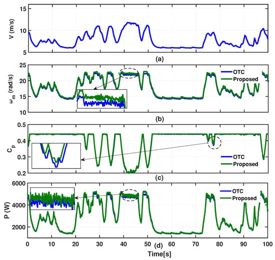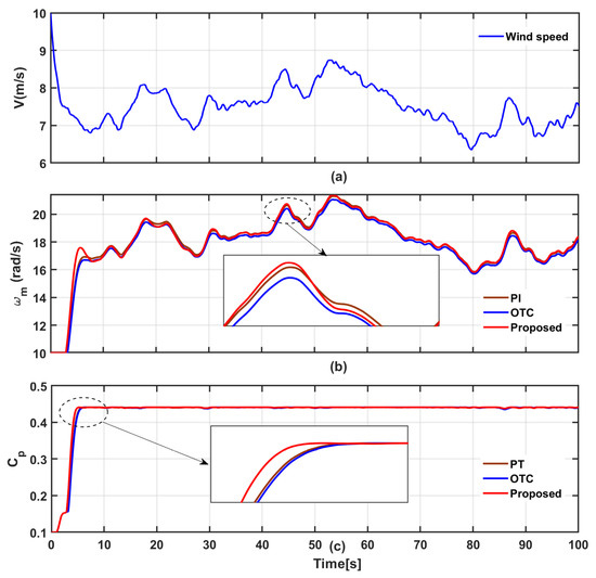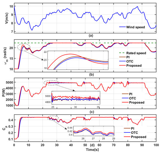 In this case, the random wind speed changes across regions II and III, with wind speeds ranging from 7.1 to 10 m/s. As mentioned earlier, when the wind speed hits 9 m/s, the PMVG rated rotor speed of 22.3 rad/s is reached. Thus, when the wind speed exceeds 9 m/s, the pitch control shifts the WT blades to the pitch angle that minimizes mechanical stress. Accordingly, the and values are also lowered. When the wind speed drops below 9 m/s, the MPPT kicks in to provide rotor speed control. In detail, Figure 11 provides the dynamic performance of the simulation results of the PI, OTC controllers and the proposed control method, respectively. Following that, Figure 11a shows the variable wind speed. At the same time, the rotor speed is presented in Figure 11b.