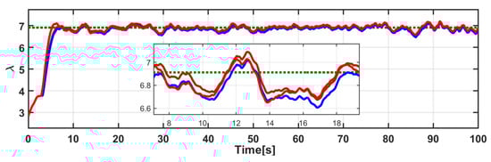 In this case, wind speed is below 9 m/s and is zero. Figure 9 shows the comparative simulation results of the PI, OTC controllers and the proposed control method, respectively. The region II random wind speed is shown in Figure 9a, with an upper limit of 9 m/s and a lower limit of 6.3 m/s. Moreover, the rotor speed tracking performance is illustrated in Figure 9b, with the different control methods. From this, it is evident that the rotor speed tracks the optimal rate much more rapidly and efficiently when comparing the proposed control method to the other control methods in terms of overshoot and settling time. From Figure 9c, we can confirm that the proposed control method can recover to very quickly compared to the PI and OTC methods. In addition, for varying wind speeds, the rotor speed tracks the reference speed to maintain a consistent power coefficient. As a result, the MPPT under region II yields the best value of . Moreover, as seen in Figure 10, we can see the TSR () can be smoothly maintained around the excellent value under the proposed control scheme.