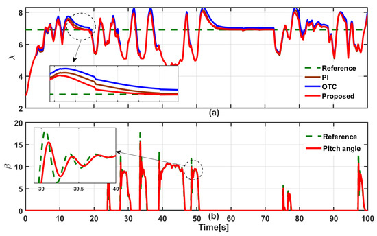 Results for case III with real wind speed. (a) Tip speed ratio . (b) Pitch angle .