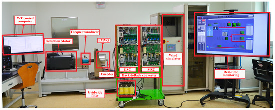 The experimental setup of the PMVG-based WECS is shown in the Figure 16. A Sinamics-S120 power controller controls a Siemens induction motor that emulates a wind turbine model. A 5 kW PMVG coupled with an induction motor and a three-phase back-to-back converter is used to rectify the generator AC voltage. The Texas Instruments TMS320F28335 DSP board with a 10 kHz sampling frequency is used to implement the control methods, and the easy DSP platform is used to monitor the response of the system. In addition, to test the efficiency of the proposed control strategy, it is compared to the OTC method, which is commonly used in industrial purposes.