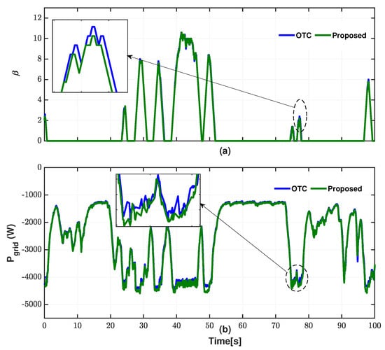 From this, it can be observed that pitch angle control is activated when the wind speed exceeds 9 m/s; then, the and values will be reduced to maintain the rotor speed below the rated speed of 22.3 rad/s. Thus, the generator power also reduced correspondingly. The enlarged figure inside Figure 11b clearly confirms that the proposed controller technique effectively achieves the MPPT target compared to the PI and OTC controllers. The corresponding power and are displayed in Figure 11c,d, respectively. The corresponding and values are illustrated in Figure 12a and Figure 12b, respectively.