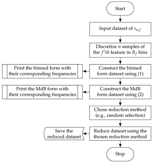 Figure 1), it merges top-down discretization approaches with a non-parametric numerosity reduction via histograms. MdBR has linear complexity and can be facilitated to reduce large multivariate data sets to smaller subsets, which could be used for model training. The approach works best for large data sets of low-dimensional and periodic data. In addition to less data storage space and a faster training time, the approach also renders the need for extra under/over-sampling strategies of imbalanced data sets superfluous. The approach is based on discretizing the data using the bins of a multidimensional histogram. Afterwards, numerosity reduction is achieved by reducing the number of samples in each bin.