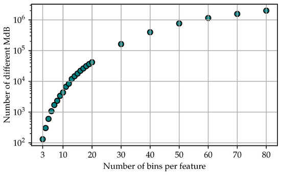 Figure 6 shows the results from 10 to 80 bins per feature. It can be seen that already, with a relatively small number of 20 bins per feature, the average accuracy of the models is at least comparable to the accuracy of the baseline models. At a number of 40 bins, the maximum accuracy is reached. If the number of bins is increased further, it is not reflected in a further increase in accuracy. However, the time required for training increases as the data are segmented into more MdB, increasing the training set size.