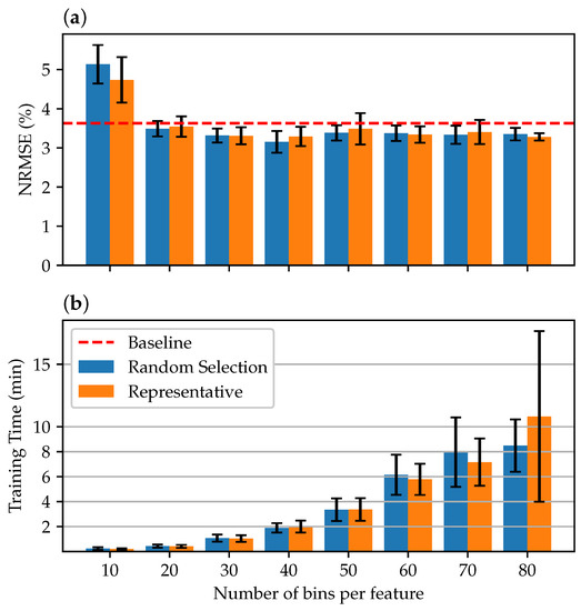 The proof of concept demonstrated that, in addition to a significant reduction in the training set, the model’s accuracy could also be constantly improved. Thus, a model comparable to the baseline could be trained with only 13 bins per feature. This corresponds to the use of 11,869 samples, which is of the entire training data set. The best models could be trained using about 40 bins, corresponding to of the data set.