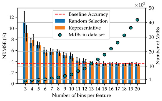 Figure 7. Along with a plot of the number of MdBs that make up each training set. It can be seen that for a data set reduced by MdBR using 13 bins per feature, the accuracy of the model is equal to the baseline accuracy. In addition, the performance of data sets formed by the representative procedure seems to be slightly better than that of the random selection procedure.