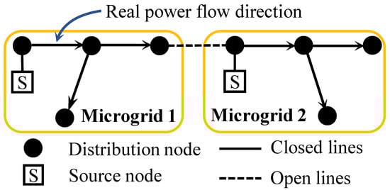 In this figure, the arrows indicate the parent–child relationships between two adjacent nodes. The reconfigured MGs are modeled as several spanning trees. Each distribution node is assigned with one virtual unit demand. In addition, source nodes are treated as the roots of different MGs and are the only sources of virtual demands. By defining the virtual demands and sources, the connectivity and the radial structures of MGs can be strictly guaranteed. Furthermore, we can further model the reconfiguration model and determine the actual directions of power flows with these concepts.