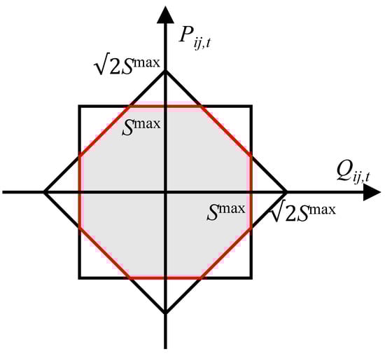 However, we need to point out that this linearization technique may have potential risks since the line capacity constraints may be violated during operation. To deal with this problem, more polygons can be used to realize an accurate approximation of the line capacity constraints. In engineering applications, it is acceptable to use two rectangular regions to approximate this constraint. Later, we further discuss the possible effects that this linearization may cause.