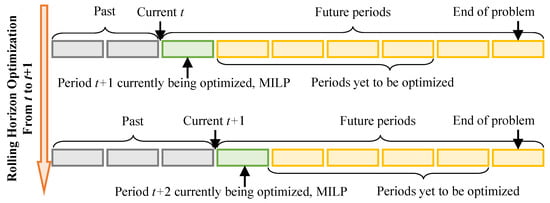 The rolling horizon heuristic optimization is an advanced method to control a multiperiod process []. Its advantage is that it allows optimizing the operation in the current period while considering the future periods simultaneously. This achieves by optimizing a finite horizon but only implementing the current period. The above optimization will be repeated until the end of the problem.