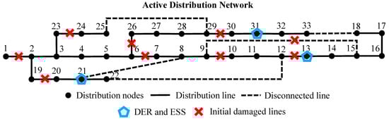The test system contains three DERs and three ESSs, which are located at bus #13, #21, and #31. The situation of line damages is shown in Figure 4. Because the repair process is quite essential in the restoration process, we set a maintenance schedule for each damaged line. The schedule is shown in Table 1, which is from [].