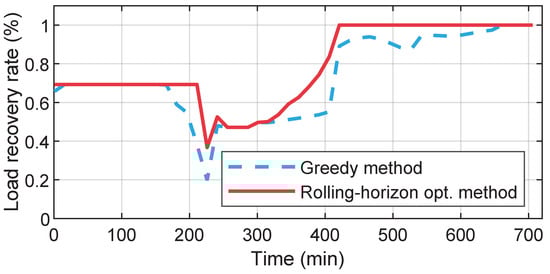 In Figure 7, comparing two methods, the rolling horizon method can restore more outage loads than the greedy method. The former can achieve full load recovery earlier than the latter. This is because more energy is stored in ESS with a control strategy obtained by the rolling horizon optimization. We find that when , the load recovery rate has decreased since the DER outputs turn to 0. However, with the existence of ESSs, the disconnected ADN can still maintain a certain load recovery rate.