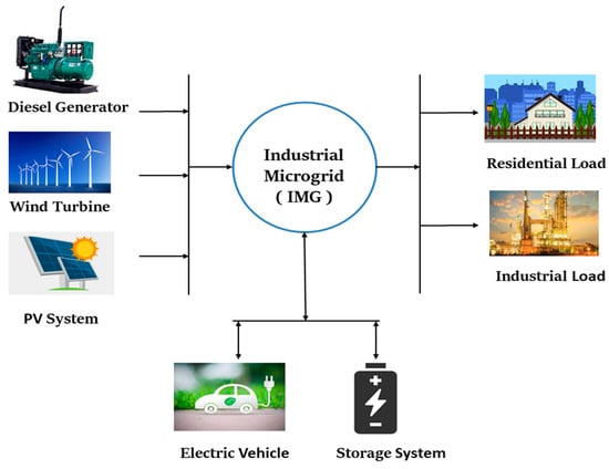 There are several different types of microgrids discussed in the literature. One of them is the IMG, which is made up of a few more industrial units connected to renewable energy sources (RES) and energy storage systems (ESS) [13]. The microgrid is generally made up of low-voltage distribution systems that are connected to the power grid via a PCC (point of common coupling) [13]. Controlling the supply–demand balance is a crucial difficulty for a microgrid’s successful implementation [14]. The connectivity of renewable sources inside the microgrid, which operates intermittently due to its availability, causes the difference between supply and demand [15]. As a result, EVs could be employed to tackle a frequency fluctuation problem, improving the reliability of the system. Due to the power necessary to keep the batteries charged, electric vehicles will have a detrimental influence mostly on the power grid when they are added to the grid. New modules or existing equipment must be upgraded to counteract this detrimental impact. However, due to the huge expenditure required, these alternatives are not practicable. The cost of updating and installing systems equipment to incorporate the EV inside a fleet with a significant margin inside the present distribution network could exceed 15% [14].