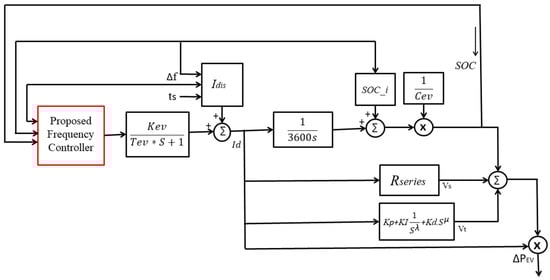 where Kev and Tevs are the EV battery’s gain and time constant respectively. The parameters Kev and Tev values are considered as 0.333 and 1, respectively, from theoretical calculations using formulas described in reference [44]. The primary purpose of this method is to maximize the use of renewable energy supplies while reducing reliance on fossil fuel plants for a clean and green environment [45,46,47].