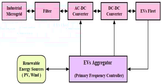 One of the biggest causes of the increasing challenges such as climate change has been fossil fuels. Transportation using conventional fuels is responsible for about 15% of overall world CO2 emissions [1,2]. Renewable power technologies have improved significantly in recent years, as the global energy crisis has become more important [3,4]. More advancement was required with the emergence of power electronics, which necessitated the existence of renewable resources such as wind or PV energies. Rapid innovations in power electronics and batteries have allowed researchers to refocus their attention away from vehicles with internal combustion engine onto electric vehicles (EVs) [5]. Due to their quick regulation ability and superior performance, EVs have been catching the eye as a technology for frequency management [6]. Furthermore, the adoption of distributed energy resources (DERs) has received a lot of attention and interest in the research field to deal with the energy problem and reduce greenhouse gas emissions [7,8]. Parallel to this, the number of industrial microgrids has exploded, owing largely to the consolidation of smaller enterprises into larger ones, as well as the installation of distributed energy supplies.