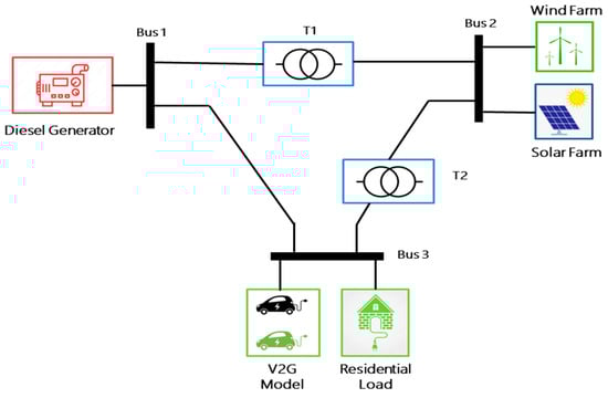 The interface of V2G and the electricity grid is depicted in Figure 5. The proposed microgrid comprises of the base power generator such as a diesel generator, sources of renewable energy, such as solar and wind energy, as well as a V2G system, which are all connected via Bus 1, Bus 2, and Bus 3. The base model includes five electric vehicles profiles and residential load. The proposed work additionally includes a control to enable or disable V2G mode. This charging technique is bidirectional, which means it may both supply and consume power in amongst grid and the charging station.