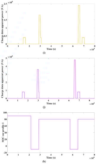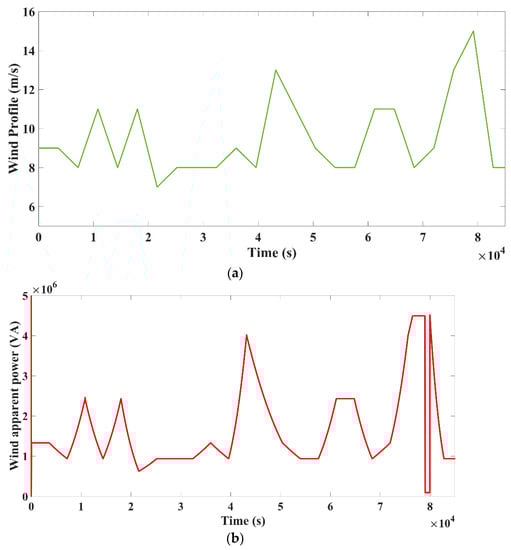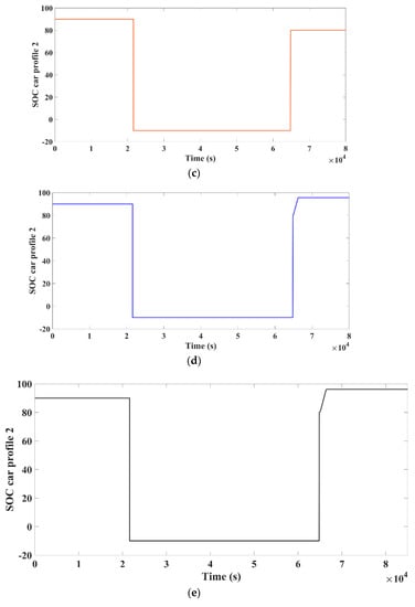 Wind farm simulations have been carried out in this case. When the wind speed surpasses 15 m/s, which is maximum speed restriction, the wind farm trips. This is to prevent damage to the wind turbine due to the increased wind speeds. When the speed of wind surpasses its normal speed of 13.5 m/s, the wind farm reconnects to the grid. Figure 8a depicts typical profile of wind during a 24-h period. The wind farm tripped after 79,200 s, which equates to 10 p.m. The wind speed will be more than that of the top set point of the 15 m/s at this time, and it returns to the normal output after a period of time when the speed of the wind returns to the nominal limits. Figure 8c–e depicts the state-of-charge of the car profile 2 for the three different cases.