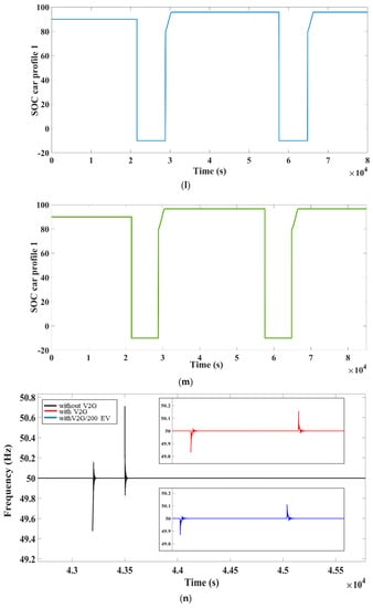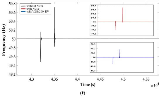 Figure 8b illustrates the scenario during a tripping of the wind turbine when V2G mode is inactive. It is worth noting that the dip is more pronounced than in case of the solar farm as the solar production is zero at night. This drop in frequency was enough to consider the grid was unstable, as well as that the load should be reduced to compensate for the grid’s negative impact. When V2G function is activated, the EVs inside the microgrid help to regulate frequency and increase the microgrid’s stability when a disturbance arises in source trip. The frequency of a grid was improved to even more acceptable bounds by raising the number of EVs in fleets from 100 to 200, as presented in Figure 8f. Furthermore, whenever the number of EVs rises, frequency stabilizes both in under and over frequency zones. Table 5 presents a summary for the deviations of frequency for all the cases. The result obtained by proposed controller has better frequency regulation compared with reference method.