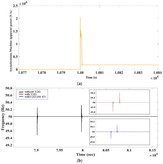 The impact of the load on grid frequency was considered in this case. In past circumstances, V2G has been shown to assist in reducing frequency variations to tolerable levels when renewables are tripped from the grid. There is an induction machine in this case, which starts at midday. If the normal power of the asynchronous motor is high, it is known that as soon as the induction machine (IM) begins to run and it destabilizes a grid frequency, which it cannot recover to a long time. Starting current was on the order of six to eight times, which can result in a system with a sudden inrush current. Figure 9a depicts the induction motor starting at midday (43,200 s).