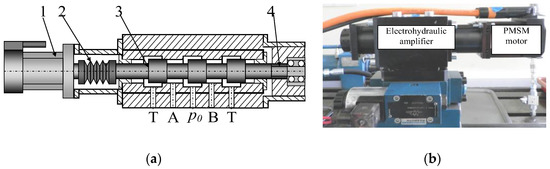 Figure 4), in which the proportional valve with PMSM was built. The stroke of the hydraulic cylinder was 200 mm; its diameter of the piston rod was