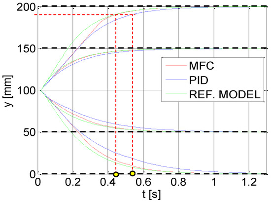 Figure 5. It has been observed that the compensation works well for different set points. The settling time for the drive controlled by MFC was about 0.44 s and for the PID it was 0.56 s (yellow points in