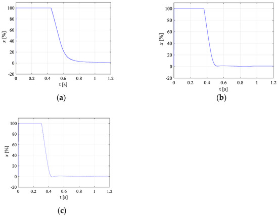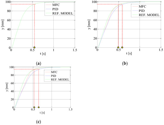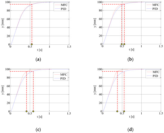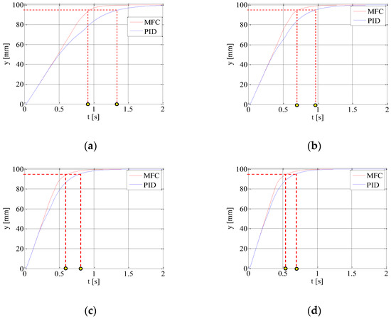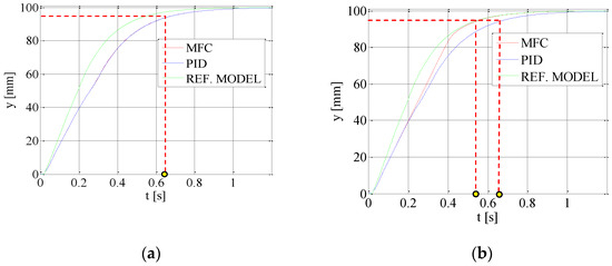 PID and MFC controllers for electrohydraulic servo proportional valve with synchronous motor were tested and compared using drive step responses. The parameters of all used PID controllers were established experimentally as follows: kp = 15, Ti = 0.001 s, and Td = 0.5 s. In order to achieve the improvement of the tested electrohydraulic drive dynamics, the gain coefficient of MFC controller Rc(s) was increased from kko = 1 to the value of kko = 4. If this value is larger, the oscillations occurred in the system. The additional flow coefficient of reference model kq_k was equal to 1.2.