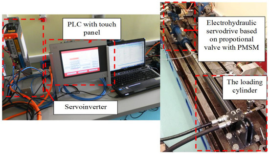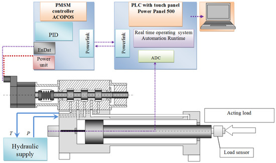 Figure 11, the structure of the laboratory test stand that was built is presented. The stand allows us to check the effectiveness of the load disturbances compensation if the proposed controller based on the MFC method is used. On the test stand, a single-acting cylinder with a proportional valve controlled by PMSM is installed. As a control unit, a PLC was used. The cylinder piston position was measured by the assembled sensor, which was a magnetostrictive sensor, built inside the cylinder. Its output signal was the voltage ±10 V. A control system was based on a master controller, consisting of a PLC with a touch panel. The motor was controlled by the servo-inverter, which acted as a slave controller. The PLC enabled real-time control, and the system worked with a cycle frequency of 1250 Hz.