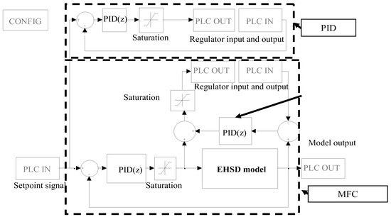 Figure 13). The software implemented on the PLC control enabled to switch between a PID and MFC controller. In the design of the control system, the rapid prototyping technique for the control system design is used. In this approach, the model of the control system has been built previously in the software environment and improved. After obtaining positive test results, it was recompiled for the C code and then implemented as one of the task classes in the PLC. Because the used industrial controller PLC worked in a discrete mode, it was necessary to discretize the continuous model of the control system. The discrete time base was established as