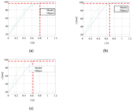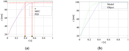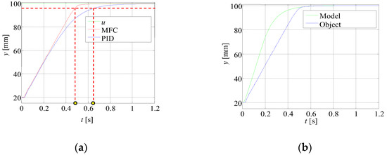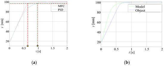 Figure 9 shows the effect of changing this parameter if the corrective controller and the model controller have equal values. Changing this parameter in the described case improves the dynamics by shortening the settling time of the MFC controller in relation to the PID controller by 0.19 s. This is because the real object conforms to a reference model with a greater gain factor.
