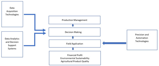 11]. As for the first goal, this can be achieved by facilitating the collection of required data from the field, as well as their fast and reliable processing, so that it is possible to adapt the applied agricultural practices. Respectively, these procedures are carried out with the combined use of ICT, such as precision equipment, Internet of Things (IoT), big data, geolocation systems (GPS), non-GPS manned vehicles, robotics, sensors, 3D printing, agricultural automation, and management information systems [