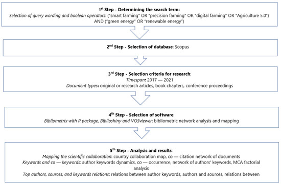 39]. The data collection was carried out in January 2022 with the entered search terms to be the following: [(“Smart farming” OR “precision farming” OR “smart agriculture”) AND (“green energy” OR “renewable energy”)]. The search was carried out in English language, and the search of the keywords was made in the titles, abstracts, the main text, and authors’ keywords of the published work in the research field. The Scopus bibliographic citation database includes various types of documents, but only original articles, book chapters, and conference proceedings were considered in the present analysis. A sum of 2000 documents was selected for this analysis. The records for each publication retrieved during the search were converted as a Scopus BibTex file and imported into Biblioshiny and VOSviewer [