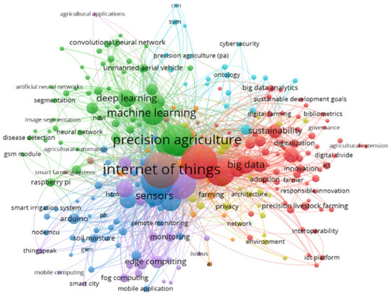 30]. This is observed by the keywords that dominate in the co-occurrence and three-field plot analysis. Concepts such as Internet of Things, deep learning, big data analytics, sensors, fog computing, artificial intelligence, and machine learning are the main characteristics of Agriculture 5.0, which lead to an overview of the latest development in the domain of smart farming [
