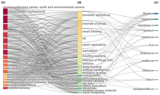 Figure 7 illustrates the relationship between sources (left), authors’ keywords (middle), and authors (right). The analysis presents the main research topics of smart farming that have been analyzed mostly by the authors in the field. The research topics are represented in the graph through the authors’ keywords. The analysis of the keywords, authors, and sources highlighted that the three mentioned as top journals in