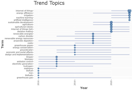 Figure 9 presents the authors’ keywords in the hierarchical arrangement of topics in smart farming, which have been discussed by scholars per year. The bigger the circle in the lines, the higher the number of references for the concept that is represented by the circle. These topics could relate to the field of smart agriculture, such as the IoT and the agricultural robots, but are not limited to that. Since 2016, researchers have started their discussion regards the integration of green energy sources into smart farms’ daily operations. Despite the use of renewable energy sources, researchers highlighted alternative energy sources such as anaerobic digestion as a source with plenty of benefits for an energy-smart farm. Anaerobic digestion is a biological process that involves the breakdown of organic matter into simpler components with the help of microorganisms under anaerobic conditions. The process of anaerobic digestion is very complex and consists of numerous physical and biochemical reactions that lead to the production of biogas consisting mainly of methane (50–75%), carbon dioxide, and traces of other gases, as well as the production of stabilized fertilizer. Anaerobic digestion, depending on the operating temperature, is divided into two main categories: (i) mesophilic and (ii) thermophilic. In mesophilic anaerobic digestion, which is the most common category among the two, the temperature ranges between 20–45 °C. The thermophilic in which higher temperatures are developed in the digester is selected when additional disinfection of the materials is required so that they can be used for the benefit of agriculture. However, independently of each of the above types, anaerobic digestion can be characterized as an extremely flexible technology that can be used for a wide range of agricultural operations such as crops, residues, animal wastes, and imported food wastes into usable energy.