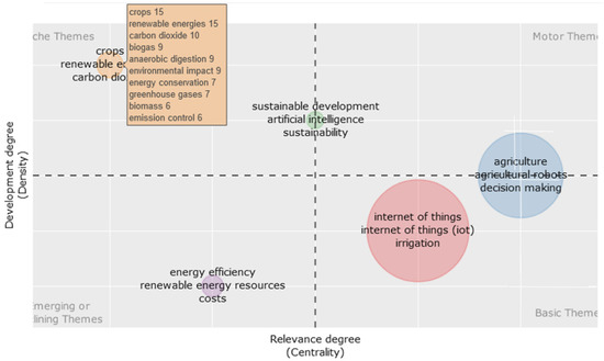 Figure 10, too. This figure describes the research themes which are obtained from the conceptual structure of the documents included in the Bibliometric analysis. The clusters in the graph indicate the themes of the research, while the size of the clusters highlights the proportional to the number of the keywords. In the figure, each quadrant represents a different theme. The quadrant in the upper-right position of the figure illustrates the motor themes, which are characterized by both high centrality and density. Niche themes are represented by the quadrant in the upper-left position of the thematic map, and this typology is characterized by low centrality and high density. Moreover, themes that are placed in the lower-right position of the thematic map are known as basic themes, while lower-left quadrants represent the emerging themes which are defined by low centrality and density. Decreases in greenhouse gases, as well as carbon dioxide, are the niche themes of an energy-smart farm by adopting green energy sources such as anaerobic digestion. One more energy source that is emerged in the niche trends of green energy sources and is strongly related to the anaerobic digestion process is biogas [