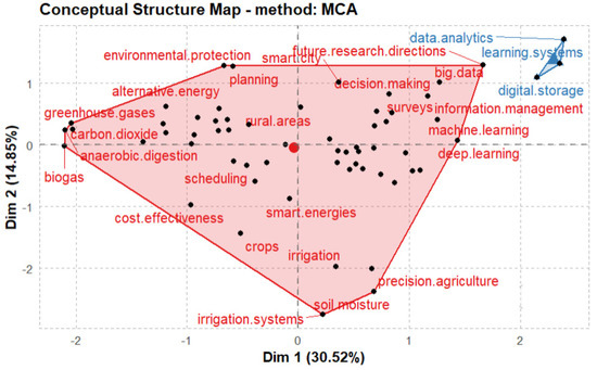 54]. MCA method is used to define, examine, and visualize the relationship among two or more categorical variables. The visualization of the results is presented in a conceptual structure map. In the current research, the map of the MCA method shows the clustering of documents and indicates the importance of a combination of alternative energy sources with emerging technologies. Thus, these findings imply that there is an essential space for future research to investigate more deeply the role and contribution of green energy sources such as anaerobic digestion and biogas. Moreover, the graph shows the contribution of emerging technologies as very important in making renewable energy sources smarter. This will help farmers to have a sustainable, energy-efficient, reduced-cost, and resilient smart farm.