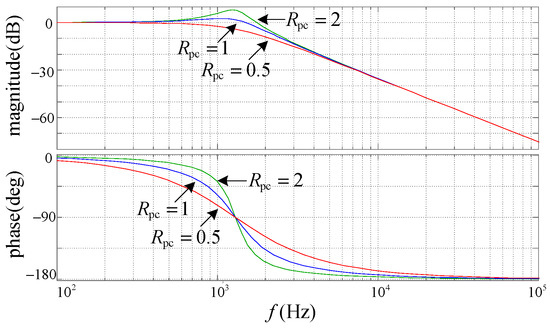 In Figure 12, is the impedance of the TSC branch; represents the series reactor of the TSC used to prevent harmonics from injecting into the capacitor. Under normal circumstances, to restrain the third and higher harmonics, the value of the series reactance ratio is usually 12%; to suppress fifth and higher harmonics, is typically 6%. When the harmonic is small enough, we can set to 2%. The closed-loop magnitude–frequency characteristic of the system is illustrated in Figure 13 in situations with different values. The single-phase compensation capacity of the TSC is 20 kVA, which means . Some parameters are as follows: , the equivalent series resistance of is ; the equivalent series resistance of the TSC branch is . The other parameters are the same as those of the previous analysis.