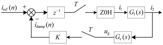 To reduce the current reference, we could only extract , which is the harmonic part of . This is equivalent to the shunt virtual harmonic resistor strategy with a resistance of 1/K implemented by the equation . Increasing K can enhance the damping effect; however, it also weakens the stability of the control system. Next, we discuss the discrete stability domain of the system. The control block diagram of the digital current controller is illustrated in Figure 4.