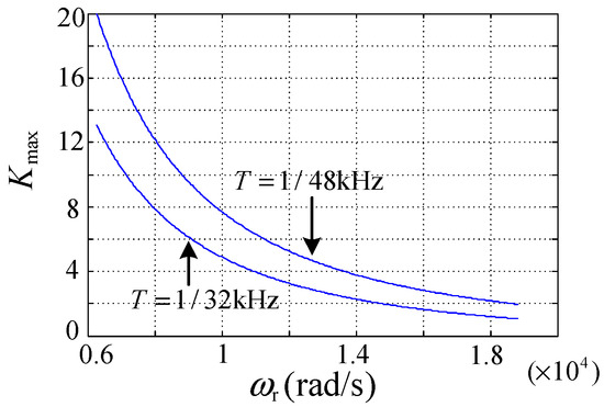 Figure 5 depicts the variation curve of with under the conditions of and . It can be obtained from (10) and Figure 5 that is inversely proportional to ; on the other hand, increasing the sampling frequency can improve the stability domain of the system. The selection of sampling frequency should conform to , which means that the sampling frequency must be six times greater than the resonant frequency; otherwise, the system will be unstable.