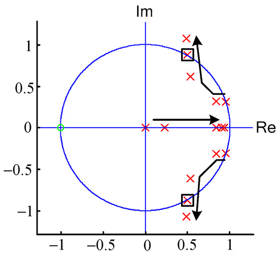 Figure 6 shows the pole diagram under the condition of , and . The values of K are 0, 1, 3, 5, and 7, respectively, and the directions of the arrows indicate the trajectory of three poles with an increase in K. The system was experienced in three stages containing an unstable process, a stable process, and another unstable process. The poles in the box correspond to the condition of , and the system becomes unstable. According to (10), it can be obtained that in this condition, which is consistent with the results of Figure 6. Some issues need to be explained here. We approximate the timing comparison control to a one-beat-delay link. Although this approximation is more or less ideal, it is effective for analyzing the influencing factors of stability and predicting the stability domain of the system. However, considering that the actual delay of the system is usually a little more than one beat, we must retain a certain margin for the result of (10) in practical applications.