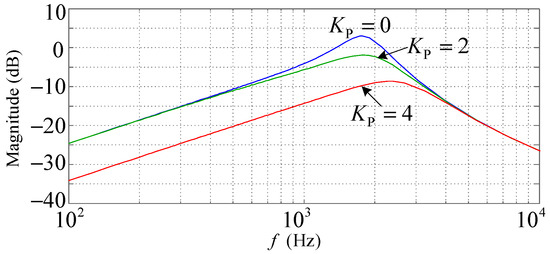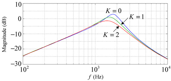 The closed-loop magnitude–frequency characteristic of the system is illustrated in Figure 9 under the condition of different virtual resistance values. The related parameters are , , , and . It can be seen in Figure 9 that the system’s stability is enhanced with an increase in virtual damping. The analysis of the stability region of the damping control coefficient K can refer to the previous study on shunt virtual resistor control.