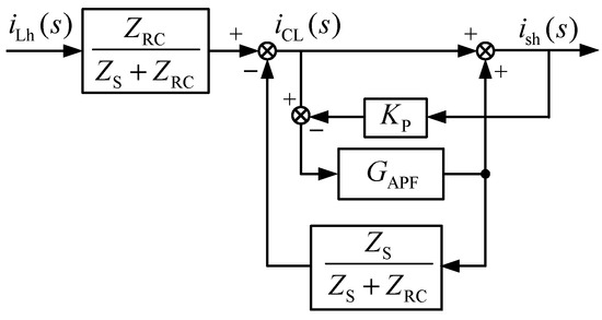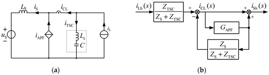 To sum up the above analysis, the system tends to be unstable under the condition of no series reactor existing in the capacitor branch. Accordingly, we can use resonance damping or the grid current feedback strategy to improve the system’s stability. Next, we will briefly analyze the condition of containing a series reactor for the capacitor branch. Taking the thyristor switched capacitor (TSC) as an example, it and the SAPF can compose a hybrid compensation system with the advantage of low cost. This system can eliminate the steady error generated from the TSC. The hybrid system’s single-phase equivalent circuit and control block diagram are shown in Figure 12.