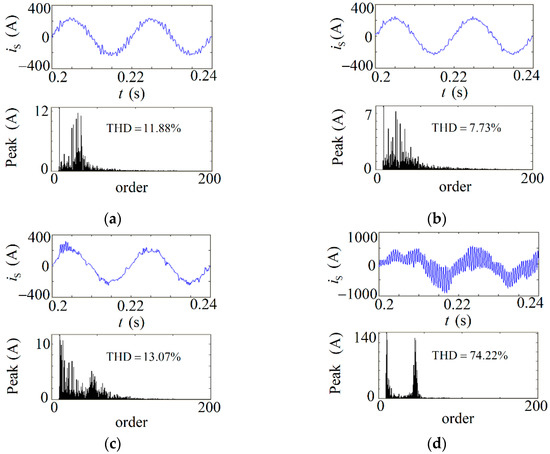 The following simulation group was used to verify the proposed restraining method for self-excited oscillation. In the simulation, the RMS value of grid line voltage was 380 V, and a three-phase SCR rectifier was used to generate the harmonic with a resistor on the DC side. The equivalent reactance on the grid side was 0.04 mH. The capacitance included in the load was 1120 μF, and the resonant frequency of the system was approximately 750 Hz. To compare the control performance of the proposed control strategy with the other control strategies, we conducted several case simulations. For case I, the SAPF adopted the full harmonic compensation strategy. For case II, the most widely used method in engineering practice, the selective harmonic compensation strategy, was used to restrain the self-excited oscillation. The 5th, 7th, 11th, and 13th harmonics were selected to be compensated. For case III, the combination of selective harmonic compensation and resonance damping strategies proposed in [22,23] was used for contrast. In addition, the 5th, 7th, 11th, and 13th harmonics were chosen to compensate, and the resonance damping coefficient was 1. For case IV, the proposed combining selective harmonic compensation and grid-side current feedback control was employed in the SAPF. The 5th, 7th, 11th, and 13th harmonics were selected, and the feedback coefficient Kp was 2. The corresponding simulation results are provided in Figure 18 and Table 2.