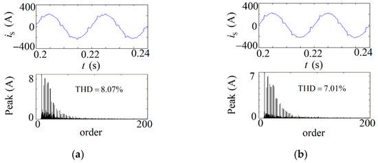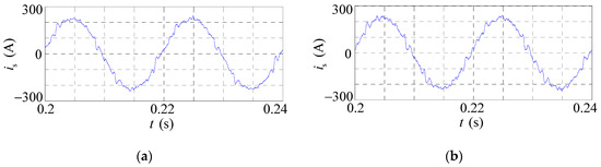A simulation to verify the stability of the hybrid compensation system composed of the SAPF and TSC was carried out. The TSC was included in the load current used for calculating the reference of the SAPF. The single-phase compensation capacity was 24.675 kVA for TSC, which corresponds to . In the simulation, the 5th, 7th, 11th, and 13th harmonics were selected to be compensated. We only used the tracking control method for the SAPF, and the sampling frequency was 16 kHz. A three-phase SCR rectifier generated the harmonic, and the resistance on the DC side was . Figure 20 shows the grid current after being compensated by the hybrid system under different values conditions. It was observed that the system was stable when both and , consistent with the theoretical analysis results.