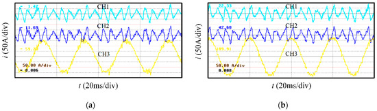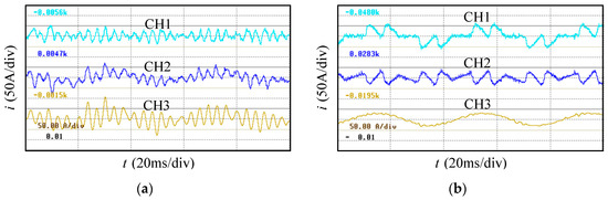 Experimental waveforms of virtual damping (CH1—SAPF current before LCL filter; CH2—SAPF current after LCL filter; CH3—grid current) (a) without virtual damping; (b) with virtual damping.